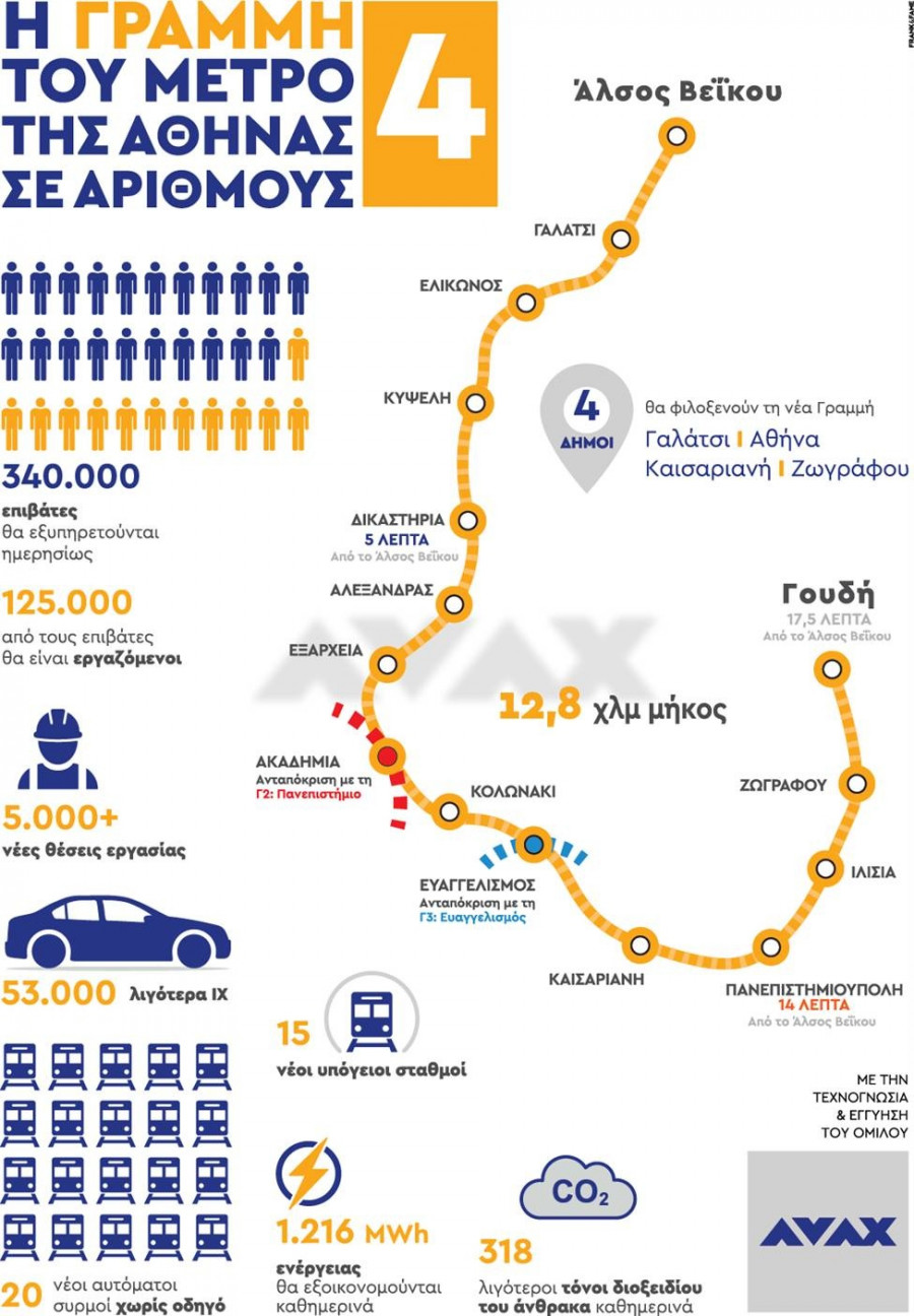 Μάλιστα, σύμφωνα με το χρονοδιάγραμμα του έργου, σε οκτώ χρόνια θα κατασκευαστούν σε μια γραμμή μήκους 12,8 χιλιομέτρων, η οποία θα εκτείνεται σε τέσσερις δήμους, 15 νέοι υπόγειοι σταθμοί σε Άλσος Βεΐκου, Γαλάτσι, Ελικώνος, Κυψέλη, Δικαστήρια, Αλεξάνδρας, Εξάρχεια, Ακαδημία, Κολωνάκι, Ευαγγελισμός, Καισαριανή, Πανεπιστημιούπολη, Ιλίσια, Ζωγράφου και Γουδή.