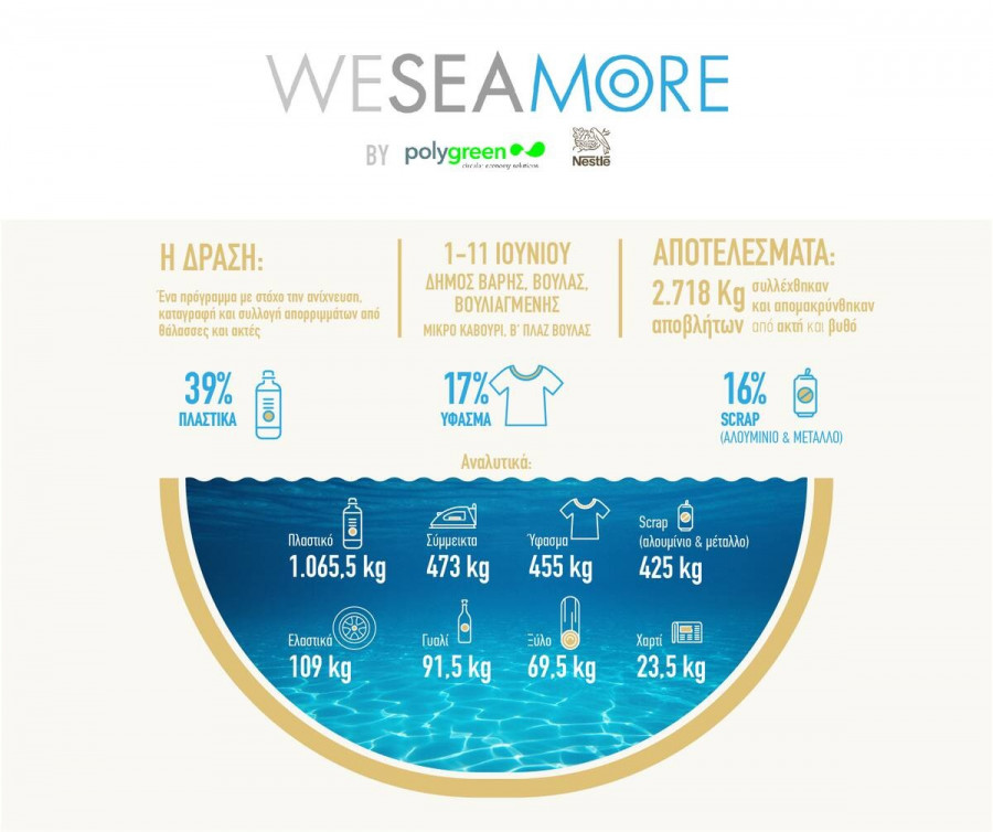 Με μεγάλη επιτυχία ολοκληρώθηκε το WE SEA MORE II, το πρωτοπόρο πρόγραμμα των Polygreen και Nestlé Ελλάς που βασίζεται σε καινοτόμες τεχνολογίες και έχει ως στόχο την ανίχνευση, καταγραφή και συλλογή των απορριμμάτων στο θαλάσσιο οικοσύστημα. Μέσα σε μόλις πέντε ημέρες συλλέχθηκαν περισσότεροι από 2,7 τόνοι αποβλήτων από την αθηναϊκή ριβιέρα, με τους πολίτες και τους επισκέπτες των παραλιών του Αγίου Νικολάου (μικρό Καβούρι) και της Β’ Πλαζ Βούλας να ανταποκρίνονται με θέρμη στο ανοιχτό κάλεσμα του Δήμου Βάρης Βούλας Βουλιαγμένης.