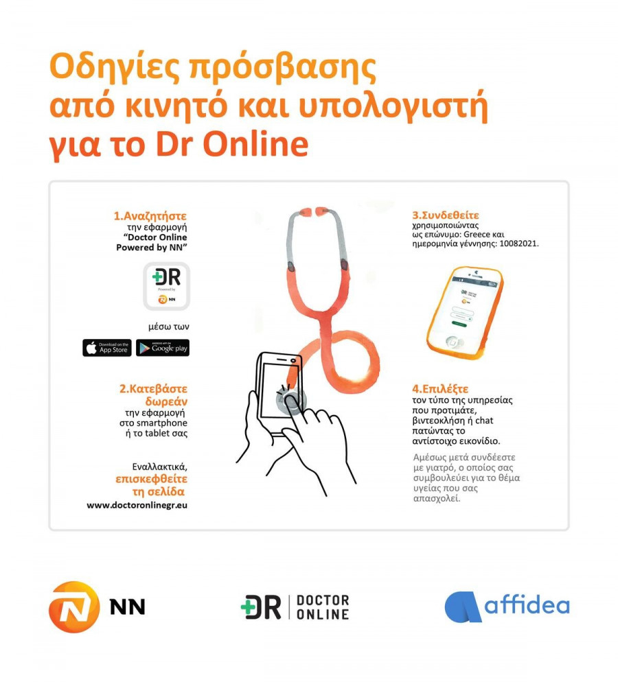 - Σε συνεργασία με τον Όμιλο Affidea και το Dr Online προσφέρεται από 13 Αυγούστου έως 30 Σεπτεμβρίου πρόσβαση στην εφαρμογή υγείας στους συνανθρώπους μας που επλήγησαν από τις φωτιές, τις γυναίκες και τους άνδρες του πυροσβεστικού Σώματος και τις εθελόντριες και τους εθελοντές δασοπυροσβέστες. Η συγκεκριμένη εφαρμογή δίνει τη δυνατότητα τηλεσυνεδρίας, μέσω βιντεοκλήσης ή chat, με ιατρούς συνεργάτες του Ομίλου Affidea, που παρέχουν συμβουλές υγείας, 7 ημέρες την εβδομάδα, 24 ώρες τη μέρα και θα είναι διαθέσιμη από την Παρασκευή, 13 Αυγούστου. Όσοι επιθυμούν να κάνουν χρήση της εφαρμογής “Doctor Online Powered by NN” θα πρέπει να την κατεβάσουν από το Apple Store ή το Google Play στο tablet ή στο κινητό τους και στη συνέχεια να χρησιμοποιήσουν ως ‘Επίθετο’: Greece και ‘Ημερομηνία Γέννησης’: 10082021. Περισσότερες πληροφορίες για την πρόσβαση στην εφαρμογή μπορείτε να βρείτε στο nnhellas.gr/anakoinosi.