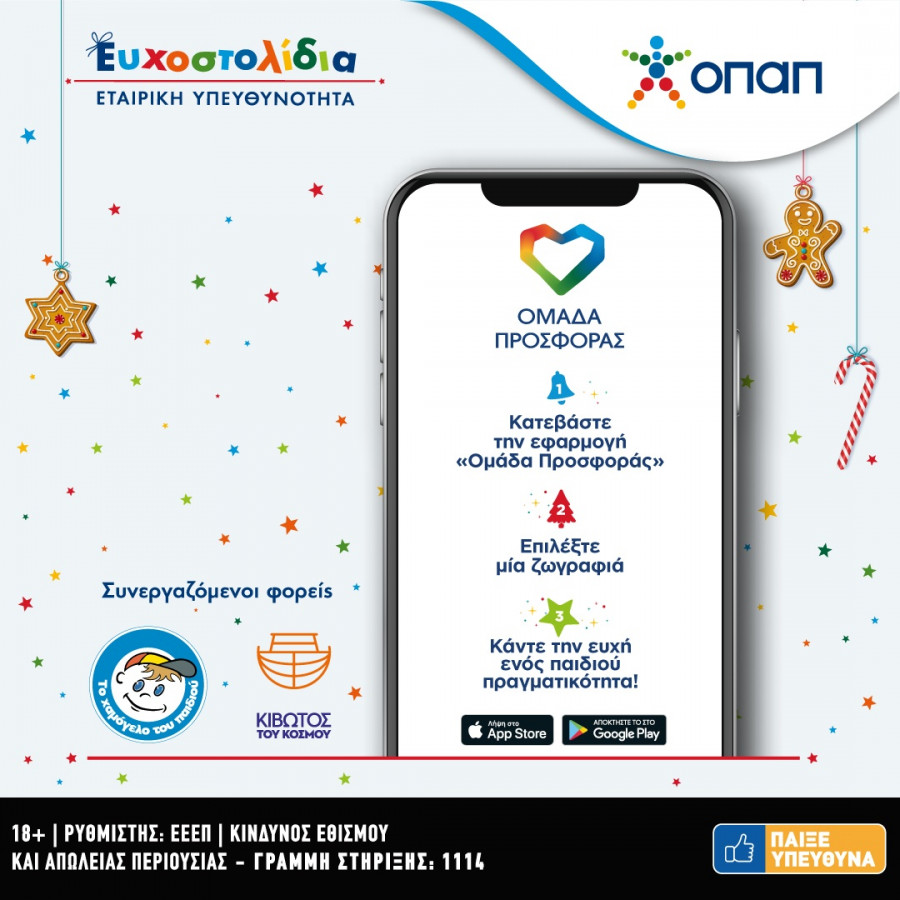Χιλιάδες παιδιά που έχουν πραγματική ανάγκη θα δουν, για όγδοη χρονιά, τις χριστουγεννιάτικες ευχές τους να γίνονται πραγματικότητα μέσα από την πρωτοβουλία Ευχοστολίδια, που υλοποιεί ο ΟΠΑΠ. Παραμένοντας ενεργά δίπλα στην ελληνική κοινωνία και στη νέα γενιά, ο ΟΠΑΠ μας καλεί όλους να συμμετάσχουμε κι εφέτος τα Χριστούγεννα σε αυτή τη μεγάλη γιορτή προσφοράς και αγάπης, με στόχο να εκπληρωθούν οι ευχές χιλιάδων παιδιών από τους οργανισμούς «Κιβωτός του Κόσμου» και «Το Χαμόγελο του Παιδιού».