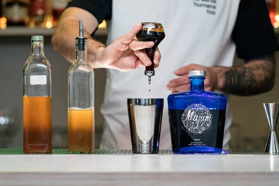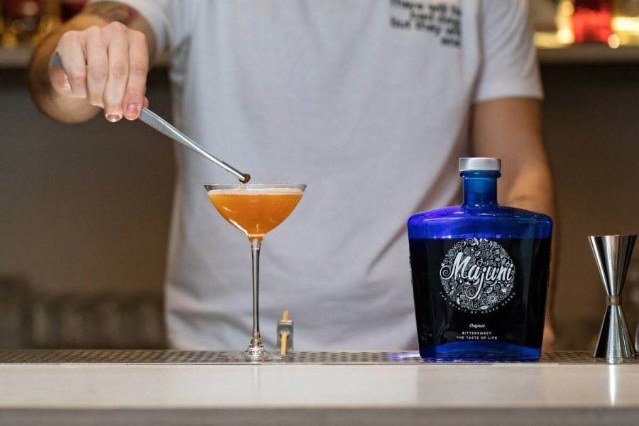 Εκείνος, λοιπόν, διάλεξε ως βάση για το ποτό μας το Majuni και μία ματιά στο βαθυγάλαζο μπουκάλι του, ήταν αρκετή για να μας κάνει να αισθανθούμε πως ήμασταν έτοιμοι να γευτούμε κάτι πρωτότυπο. Διότι γνωρίζαμε πως το συγκεκριμένο ελληνικό βοτανικό ποτό, μπορούσε να αποτελέσει τη βάση για πολλούς και ιδιαίτερους γευστικούς συνδυασμούς, που θα έφερναν τη γοητεία της φύσης στα ποτήρια μας. Ο δικός μας «αλχημιστής», λοιπόν, δηλαδή ο bartender του «The Bar In Front of the Bar», Κωνσταντίνος Θεοδωρακόπουλος, έπιασε στα χέρια του το μπουκάλι με το Majuni και έκανε το πρώτο βήμα για να προσθέσει λίγη μαγεία στα cocktails μας.