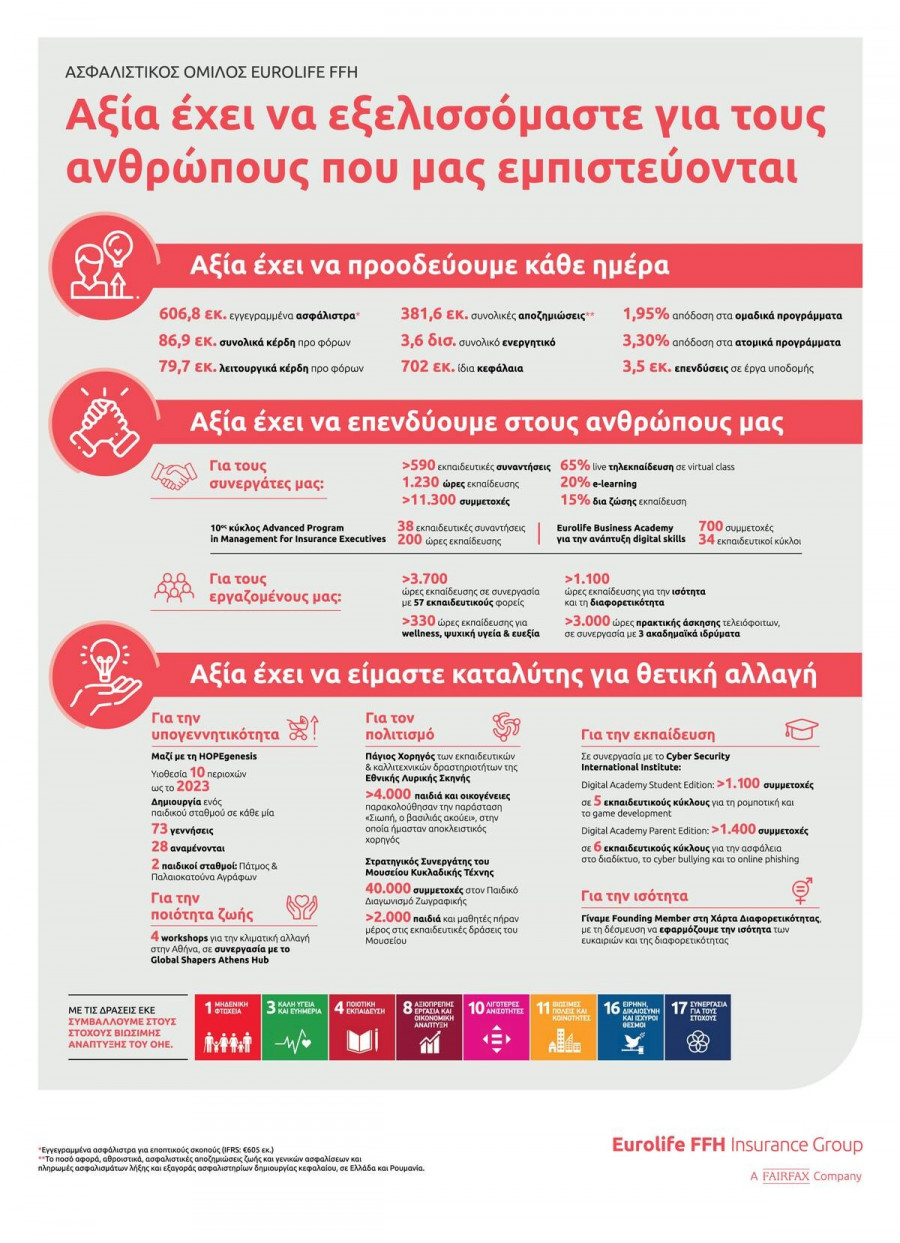Για τον Όμιλο Eurolife FFH, μέλος του ομίλου της Fairfax Financial Holdings Limited, το 2021 ήταν μια χρονιά σημαντικών οικονομικών επιδόσεων που επιβεβαιώνουν την ηγετική του θέση στην ελληνική ασφαλιστική αγορά. Για τον Όμιλο, αξία έχει να εξελίσσεται κάθε ημέρα, ακολουθώντας ένα σταθερό πλάνο ανάπτυξης που αποδίδει, με στόχο να προσφέρει περισσότερα σε κάθε άνθρωπο που τον εμπιστεύεται και στην κοινωνία ευρύτερα.