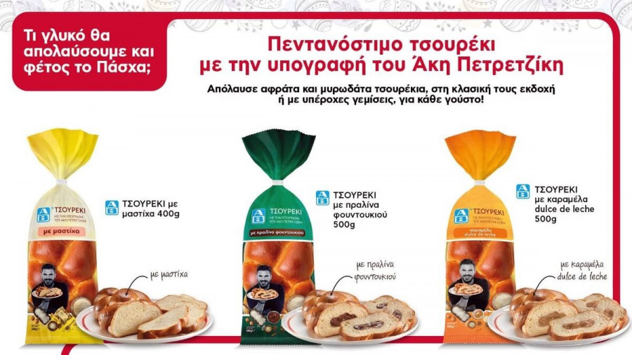 Αφού λοιπόν διασφαλίσαμε τον βασικό πρωταγωνιστή του πασχαλινού μας τραπεζιού, το νόστιμο και ποιοτικό κρέας, συνεχίζουμε με την επιλογή των γλυκών. Πάσχα χωρίς τσουρέκι, φυσικά, δεν γίνεται και η ΑΒ μας δίνει την ευκαιρία να δοκιμάσουμε τα λαχταριστά τσουρέκια του πιο αγαπητού σεφ στην Ελλάδα, του Άκη Πετρετζίκη! Αποκλειστικά στα καταστήματα AB βρίσκουμε τα μυρωδάτα τσουρέκια, είτε στην κλασική τους εκδοχή με μαστίχα ή με λαχταριστές γεμίσεις όπως πραλίνα φουντουκιού και καραμέλα dulce de leche, όλα με την υπογραφή του Άκη Πετρετζίκη και την ποιότητα της ΑΒ.