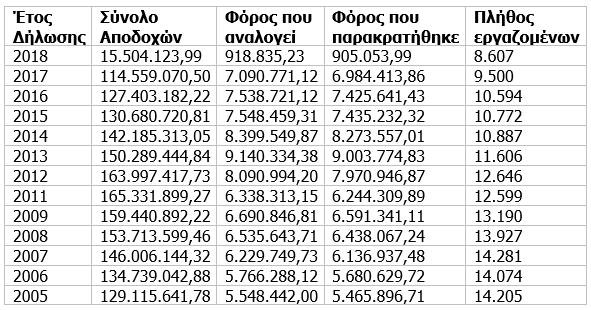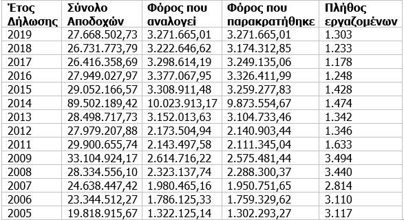 Από τον πίνακα που παραθέτουμε προκύπτει πως από το 2005 έως το 2009 η ΦΑΜΑΡ εμφάνιζε εργαζόμενους που στον αριθμό άγγιζαν τους 3.200 μεσοσταθμικά σε ετήσια βάση και οι οποίοι λάμβαναν κατά μέσο όρο ετήσιες αποδοχές ύψους 8.000 ευρώ. Ξαφνικά από το 2011 ο αριθμός των εργαζομένων μειώνεται σχεδόν στο μισό και οι ετήσιες απολαβές τους μεταξύ 2011 και 2019 υπερδιπλασιάζονται και σε μέσα επίπεδα διαμορφώνονται στα 25.500 ευρώ περίπου! Μάλιστα, το 2014 το ετήσιο κόστος για την καταβολή μισθών άγγιξε τα 90 εκατ. ευρώ και οι μέσες ετήσιες απολαβές για κάθε εκ των 1.474 εργαζομένων της ΦΑΜΑΡ εκείνο το έτος ανήλθαν σε μέσα επίπεδα σε 60.720 ευρώ ανά εργαζόμενο! Η δυσαναλογία αυτή όπως καταγράφεται στις Δηλώσεις Φόρου Μισθωτών Υπηρεσιών είναι αξιοπρόσεκτη.