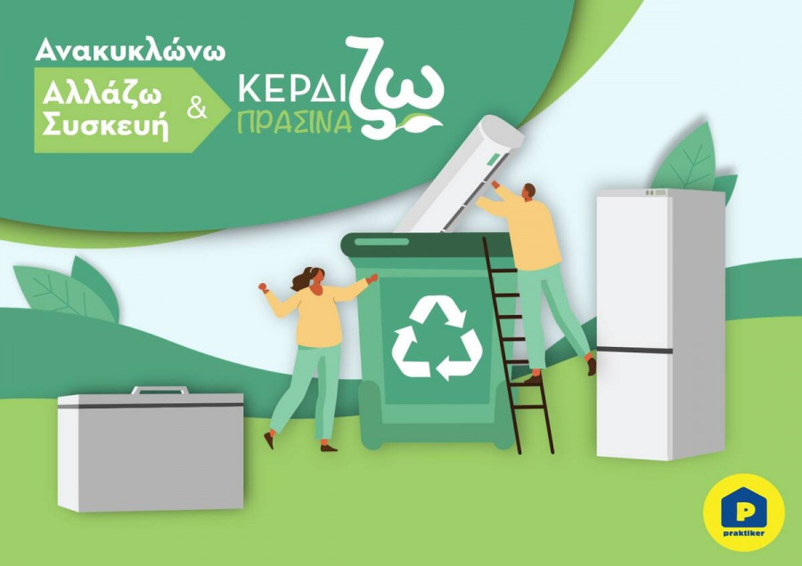 Φυσικά, η Praktiker δε θα μπορούσε να απουσιάζει από το πρόγραμμα επιδότησης «Ανακυκλώνω – Αλλάζω συσκευή», υποστηρίζοντας όλα τα νοικοκυριά αλλά και τη βιωσιμότητα του πλανήτη, καθώς αφορά στην αντικατάσταση και ανακύκλωση των παλαιών ενεργοβόρων κλιματιστικών, ψυγείων και καταψυκτών μας με νέες συσκευές, με επιδότηση για την ανακύκλωση κάθε συσκευής που κυμαίνεται από 30% έως 50%. Παράλληλα, η Praktiker προσφέρει και το πρόγραμμα “Ανακυκλώνω και Κερδίζω πράσινα”, μέσω του οποίου επιδοτείται ποσοστό του πραγματικού κόστους αγοράς κάθε νέας συσκευής που ανακυκλώνεται, κερδίζοντας δωροεπιταγές ανακύκλωσης, έως και €100 για επόμενη αγορά. Ταυτόχρονα, η Praktiker φροντίζει και για την ενημέρωση και εκπαίδευσή μας, μέσω του “Εξοικονομώ και Κερδίζω πράσινα” μας μαθαίνει πως, αντικαθιστώντας την παλιά μας συσκευή ψύξης, πλύσης και κλιματισμού, με συσκευές νέας τεχνολογίας, συμβάλλουμε στη μείωση εκπομπών ρύπων, εξοικονομώντας χρήματα, ενώ μέσω της εξειδικευμένης ομάδας της «Clima Experts» βρίσκεται δίπλα μας σε κάθε στάδιο, από την επιλογή μέχρι την εγκατάσταση, να μας κατευθύνει και να μας υποστηρίξει.