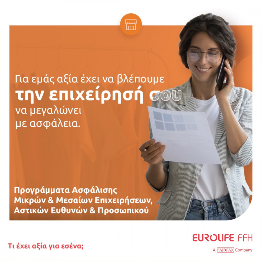 Για τη Eurolife FFH, αξία έχει να βρίσκεται δίπλα στις επιχειρήσεις και να υποστηρίζει τους ιδιοκτήτες τους, ώστε να μπορούν να φροντίζουν για το μέλλον της επιχείρησής τους όπως το έχουν ονειρευτεί. Με τις προτάσεις της για την ασφάλιση των επιχειρήσεων, τηρεί τη δέσμευσή της να επενδύει σε λύσεις και προϊόντα που ανταποκρίνονται με συνέπεια στις ανάγκες τους και τους ενθαρρύνει να καταφέρνουν περισσότερα καθημερινά.