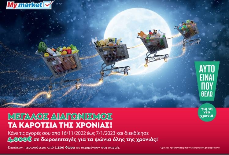 Τα My market φέτος τα Χριστούγεννα δημιουργούν για πρώτη φορά στην ιστορία τους μια 360ο εορταστική καμπάνια που γιορτάζει την πιο λαμπερή περίοδο του έτους. Η νέα καμπάνια με τίτλο «Τα Καρότσια της Χρονιάς» παρουσιάζει το μεγάλο εορταστικό διαγωνισμό του δικτύου με δώρα αξίας 4.000 ευρώ το καθένα για τα καρότσια ΟΛΗΣ της χρονιάς. Η μαγική καμπάνια μοιράζει άμεσα και καθημερινά δώρα που ξεπερνούν συνολικά τα 100.000 ευρώ.