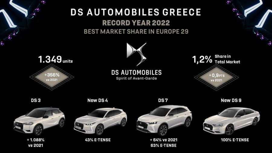 Αξίζει να σημειωθεί πως το συνολικό νούμερο των πωλήσεων, αφορά στην πραγματικότητα μόνο τα τρία μοντέλα της Mάρκας, καθώς το τέταρτο DS 9, έφτασε στην ελληνική αγορά στο τέλος του 2022 οπότε και δεν πρόλαβε να δείξει τη δυναμική του. Στα αξιοσημείωτα της επίδοσης των μοντέλων της DS Automobiles στην ελληνική αγορά, είναι η αύξηση των πωλήσεων του DS 3 Crossback (x10 σε σχέση με το 2021) και του DS 7 Crossback κατά 64% σε σχέση με το 2021, καθώς και το ότι το νέο DS 4, σε ποσοστό 43% διατέθηκε στην Plug-in Υβριδική έκδοση E-TENSE.