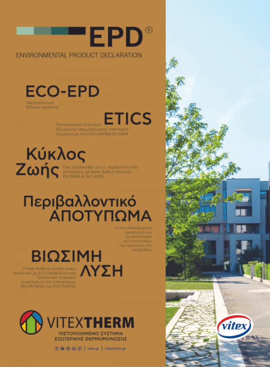 Το Πιστοποιημένο Σύστημα Εξωτερικής Θερμομόνωσης VitexTherm, της Vitex διαθέτει πλέον περιβαλλοντική δήλωση EPD (Environmental Product Declaration), ένα πλήρες προφίλ περιβαλλοντικών επιπτώσεων για όλο τον κύκλο ζωής του προϊόντος. Το αποτύπωμα του προϊόντος στο περιβάλλον υπολογίζεται σύμφωνα με αυστηρά διεθνή πρότυπα (ΕΝ-15804 & ISO 14025).