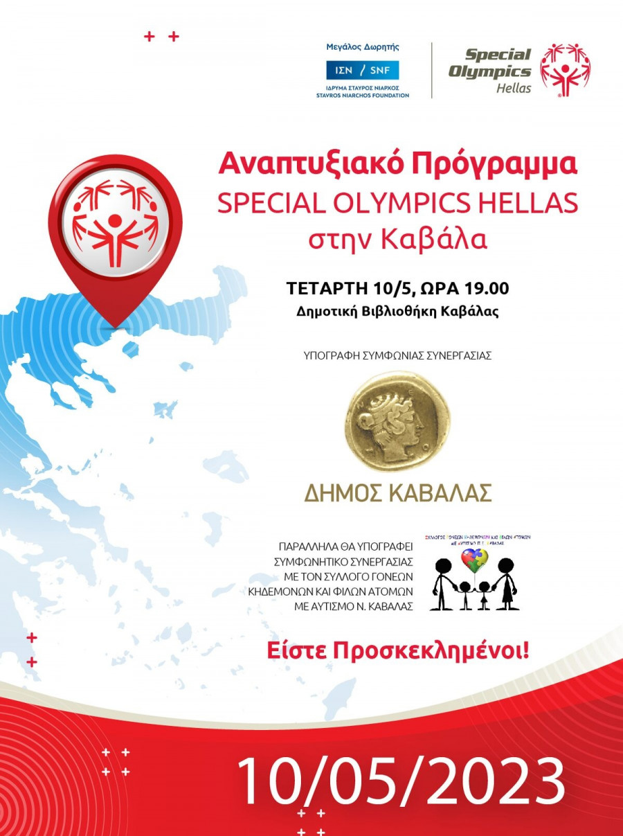 Στην Καβάλα ξεκινά Τοπικό Πρόγραμμα των Special Olympics Hellas, αποτελώντας τον 19ο σταθμό του Αναπτυξιακού Προγράμματος, που υλοποιείται με την αμέριστη υποστήριξη του Ιδρύματος Σταύρος Νιάρχος σε συνεργασία με την Τοπική Αυτοδιοίκηση και τους αρμόδιους φορείς, για την σωματική και ψυχική ευεξία ατόμων με νοητική αναπηρία και την ένταξή τους με γόνιμο τρόπο στην κοινωνία, μέσω του αθλητισμού.