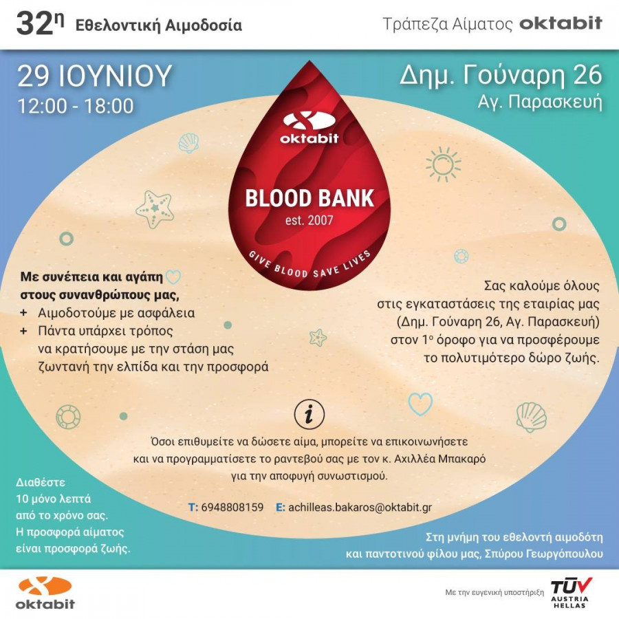 H Οktabit διοργανώνει στις 29 Ιουνίου 2023 την «32η Εθελοντική Αιμοδοσία της Τράπεζας Αίματος Oktabit» και με χαρά προσκαλεί τους συνεργάτες της στη γιορτή προσφοράς και αλληλεγγύης.