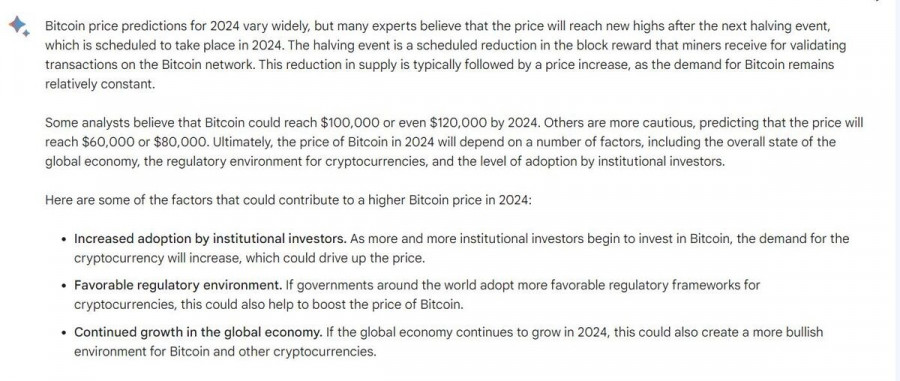 H τιμή που θα έχει το Bitcoin το 2024 εξαρτάται από αρκετούς παράγοντες και ο Bard, τοποθετούν την τιμή στα 60.000 με 80.000 δολάρια. Ωστόσο, αρκετά πιθανό είναι και το σενάριο να δούμε το $BTC να φτάνει ακόμη και τις 100.000 ή 120.000 δολάρια. Τιμή που θα σήμαινε άνοδο 4x περίπου, από την τιμή που έχει τώρα.