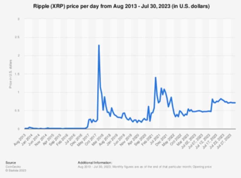 Σύμφωνα με τα στοιχεία της Statista (βλ. διάγραμμα παρακάτω) από το 2013 έως το 2017, το XRP αυξήθηκε σε τιμή από 0,01 $ σε 2,28 $ για κέρδη ύψους 22.700% με υψηλότερη σημείο τα 3,84 $ το οποίο θα έφερνε μεγάλα κέρδη σε μικροεπενδυτές αν τους είχε δοθεί η ευκαιρία να αγοράσουν XRP.