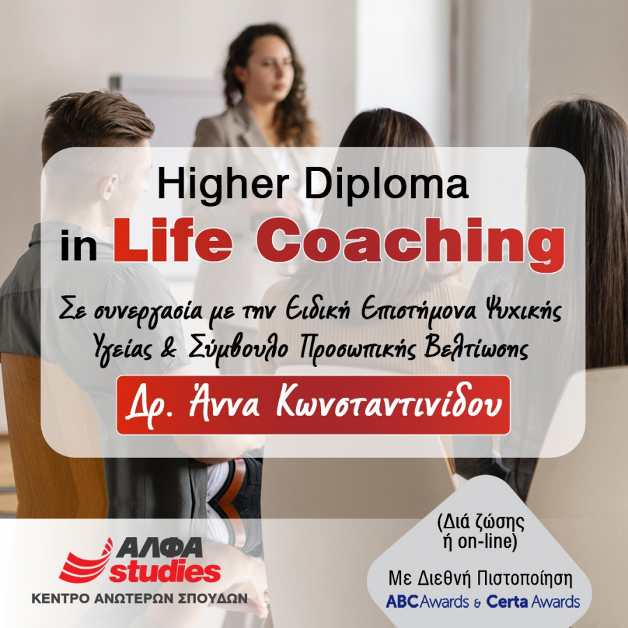 Το εξειδικευμένο στα προγράμματα Κοινωνικών & Ανθρωπιστικών Σπουδών Κέντρο Ανωτέρων Σπουδών ΑΛΦΑ studies σε Αθήνα, Πειραιά, Γλυφάδα & Θεσσαλονίκη ανακοινώνει έναρξη στις 15 Νοεμβρίου για το “Higher Diploma in Life Coaching”. Mε εισηγήτρια τη Δρ. Άννα Κωνσταντινίδου, Ειδική Επιστήμονα Ψυχικής Υγείας & Σύμβουλο Προσωπικής Ανάπτυξης/ Βελτίωσης, το εν λόγω κορυφαίο πρόγραμμα επαγγελματικής εξειδίκευσης εντάσσεται στα –μοναδικά στην Ελλάδα- προγράμματα APS: Advanced Professional Studies!