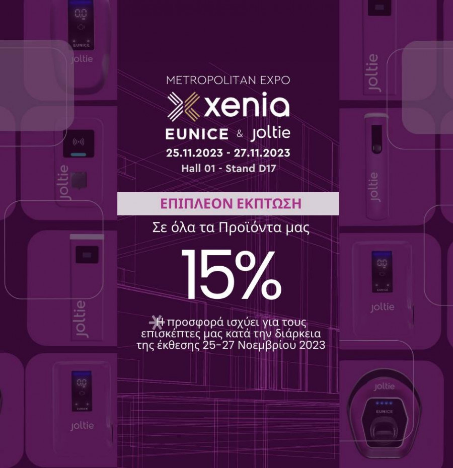 15%. - Ένας φορτιστής «Joltie Home Charger» θα κληρωθεί μετά το πέρας του τριημέρου της έκθεσης ανάμεσα στα ονόματα των επισκεπτών που θα έχουν αφήσει τα στοιχεία τους στο Περίπτερο.