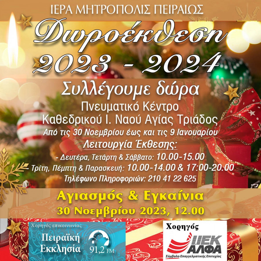 Η Χριστουγεννιάτικη Δωροέκθεση θα φιλοξενηθεί από τις 30 Νοεμβρίου έως και τις 9 Ιανουαρίου στο Πνευματικό Κέντρο του Καθεδρικού Ι. Ναού Αγ. Τριάδος στον Πειραιά, όπου και θα τελεστεί με κάθε επισημότητα και ο Αγιασμός από τον Σεβασμιώτατο Μητροπολίτη Πειραιώς κκ. Σεραφείμ, την ημέρα των εγκαινίων, Πέμπτη 30 Νοεμβρίου στις 12.00.