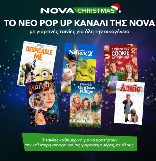 Έτσι, θα απολαύσουμε επίσης, από τις 15 Δεκεμβρίου έως τις 4 Ιανουαρίου, το γιορτινό pop up κανάλι Νοva Christmas τρεις οικογενειακές ταινίες back to back κάθε μέρα -σύνολο 45 ταινίες για μικρούς και μεγάλους. Το Novalifε γιορτάζει κι αυτό τα Χριστούγεννα, καθώς στις 23 και 24 Δεκεμβρίου θα προβάλλει τους ημιτελικούς του Νο1 show «America’s got Talent», με τον μεγάλο νικητή να αναδεικνύεται στον τελικό που θα προβληθεί ανήμερα των Χριστουγέννων. Επιπλέον, κάθε βράδυ στις 21:00, προβάλλεται μια ταινία για κάθε ηλικία και για όλα τα γούστα, ενώ μετά ακολουθεί το «The Tonight Show Jimmy Fallon» σε Χριστουγεννιάτικο στυλ.