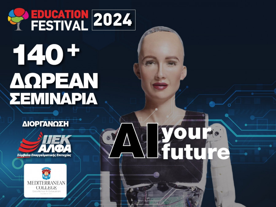 Με σύνθημα “ΑΙ your future”, οι εκπαιδευτικοί φορείς ΙΕΚ ΑΛΦΑ & Mediterranean College –ορμώμενοι από τις επαναστατικές πρωτοβουλίες τους να φέρουν για 1η φορά στην Ελλάδα τη SOPHIA (πρώτη πολίτη-android με διαβατήριο στον κόσμο), αλλά και να δημιουργήσουν το πρωτοποριακό mySOPHIA AIcommunity- παρέχουν με το EDUCATION FESTIVAL 2024 ΔΩΡΕΑΝ εκπαίδευση και εξειδικευμένες γνώσεις γύρω από αυτήν, καθώς κάθε χώρος-κλάδος (Τεχνολογία, Τουρισμός, Μόδα, Business, Πληροφορική, Επισιτισμός κ.ά.) παρουσιάζει τις δικές του ανάγκες.