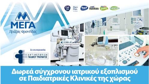 Η ΜΕΓΑ προσφέρει για 8η συνεχή χρονιά ιατρικό εξοπλισμό σε παιδιατρικά τμήματα νοσοκομείων στην Ελλάδα. Οι δωρεές στα παιδιατρικά τμήματα των νοσοκομείων περιλαμβάνουν σύγχρονα ιατρικά μηχανήματα, καθώς και αναγκαίο ιατροφαρμακευτικό και ιατρικό εξοπλισμό για το Νοσοκομείο Παίδων Πεντέλης, το Νοσοκομείο Παίδων Αγία Σοφία, το Π.Γ.Ν. Ηρακλείου «ΠΑΓΝΗ», την Παιδιατρική Κλινική του Γ. Ν. Θεσσαλονίκης «Γ. Γεννηματάς- Αγ. Δημήτριος», τη Μονάδα Αυξημένης Φροντίδας Νεογνών της Α΄ Παιδιατρικής Κλινικής του Εθνικού Καποδιστριακού Πανεπιστημίου Αθηνών στο Νοσοκομείο Παίδων «Η Αγία Σοφία», τη Μονάδα Εντατικής Θεραπείας Παίδων και