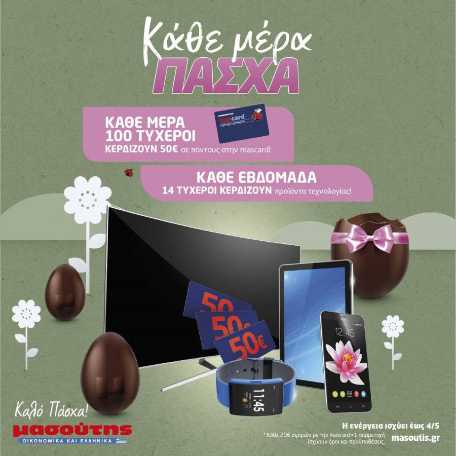 Από 15 Απριλίου έως 4 Μαΐου 2024, με αγορές από οποιοδήποτε κατάστημα Μασούτης, αλλά και από το e-shop www.masoutis.gr, κάθε μέρα 100 τυχεροί κερδίζουν 50€ σε πόντους στην mascard και κάθε εβδομάδα 14 τυχεροί κερδίζουν προϊόντα τεχνολογίας!