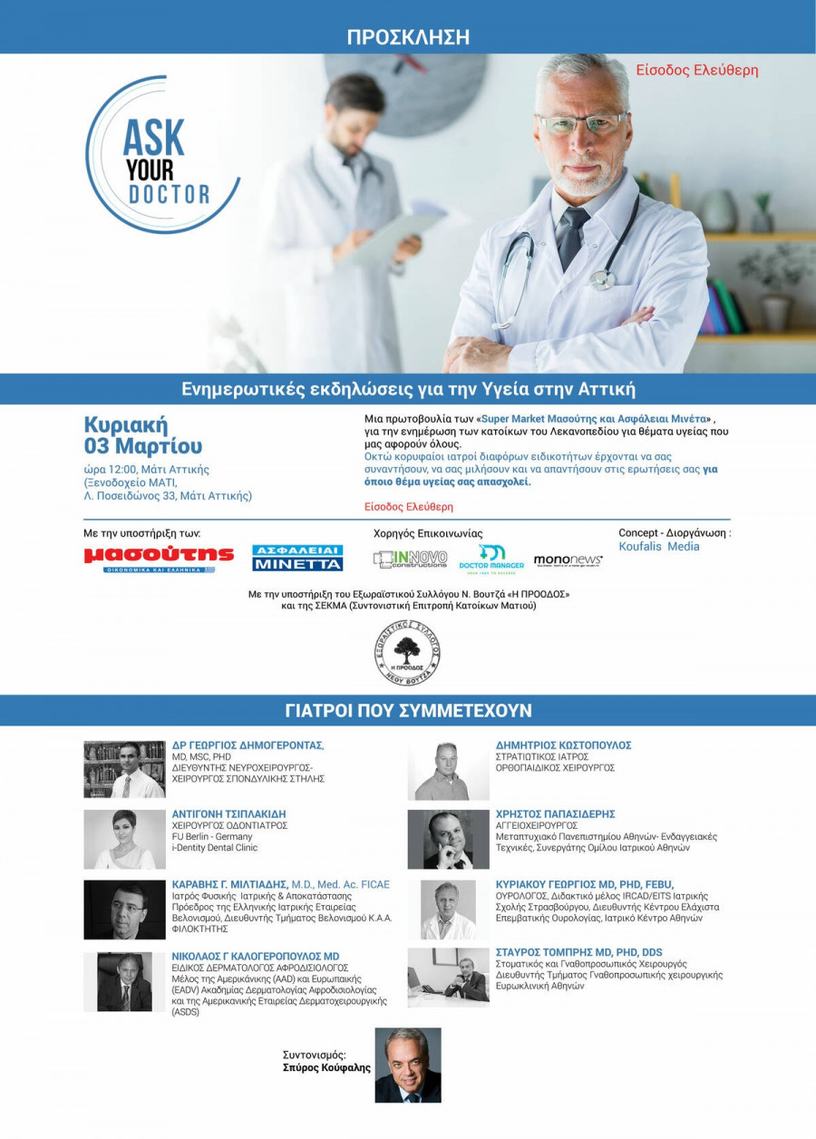 Στο Μάτι Αττικής, μία περιοχή που θρήνησε δεκάδες θύματα από την καταστροφική πυρκαγιά το καλοκαίρι του 2018, πρόκειται να πραγματοποιηθεί η δεύτερη εκδήλωση «ASK YOUR DOCTOR» την Κυριακή 3 Μαρτίου 2019 και ώρα 12:00 το μεσημέρι στο ΞΕΝΟΔΟΧΕΙΟ «ΜΑΤΙ» (Λ. Ποσειδώνος 33, Μάτι Αττικής) , με την υποστήριξη του Εξωραϊστικού Συλλόγου Ν. Βουτζά «Η ΠΡΟΟΔΟΣ» και της ΣΕΚΜΑ (Συντονιστική Επιτροπή Κατοίκων Ματιού).