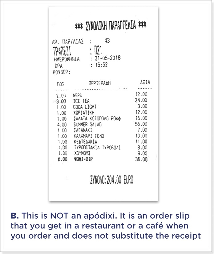 Έτσι σε όλες τις περιπτώσεις, προτού να πληρώσετε, έχετε το δικαίωμα να ζητήσετε μια απόδειξη και δεν είστε υποχρεωμένοι να πληρώσετε εάν δεν έχετε κάποια απόδειξη. Είναι τόσο απλό να λέτε στα ελληνικά: «Apodixi please»!