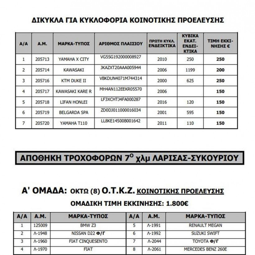 (δ) μία ομαδική κατηγορία δικύκλων για διάλυση μη κοινοτικής προέλευσης και (ε) ένα λεωφορείο για διάλυση άνω των 3,5 τόνων του Τελωνείου Λάρισας, τα οποία βρίσκονται στην αποθήκη φύλαξης τροχοφόρων στο 7ο χλμ. Λάρισας-Συκουρίου, επιπλέον,