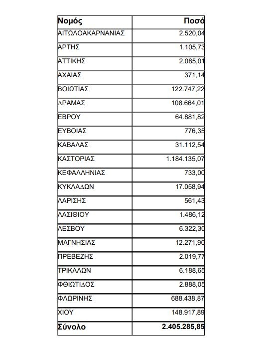Το μεγαλύτερο ποσό θα πληρωθεί στο Νομό Καστοριάς και ακολουθεί ο Νομός Φλώρινας και ο Νομός Χίου.