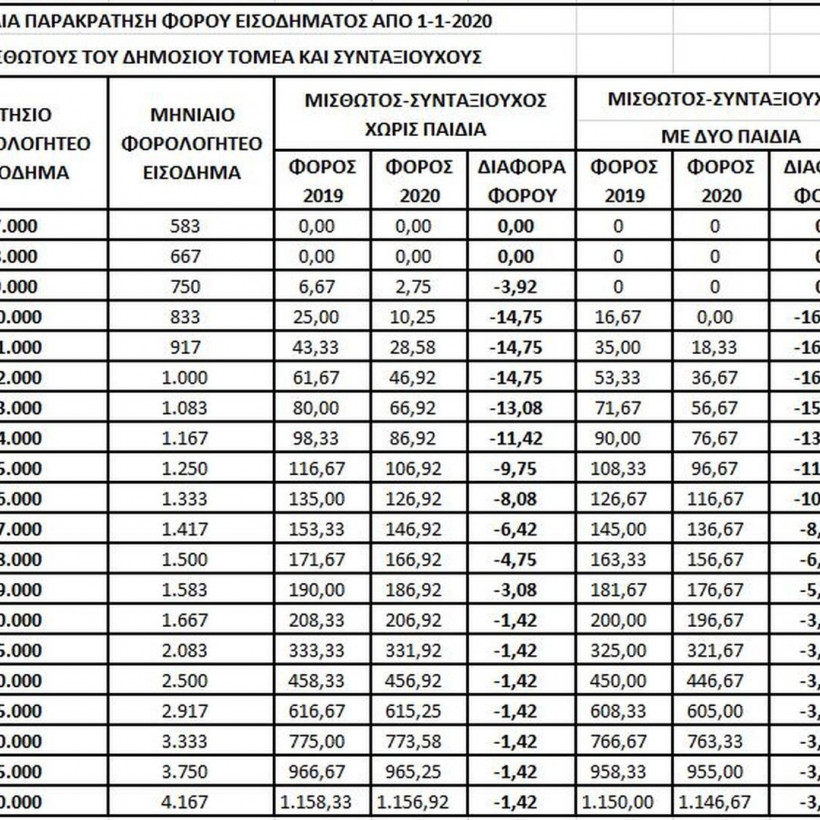 Αυξήσεις στις καθαρές αποδοχές τους θα δουν από τον Ιανουάριο του 2020 οι μισθωτοί και οι συνταξιούχοι λόγω της μείωσης των συντελεστών στη νέα κλίμακα φορολογίας εισοδήματος και των νέων αυξημένων αφορολόγητων ορίων ανάλογα με τον αριθμό των παιδιών.