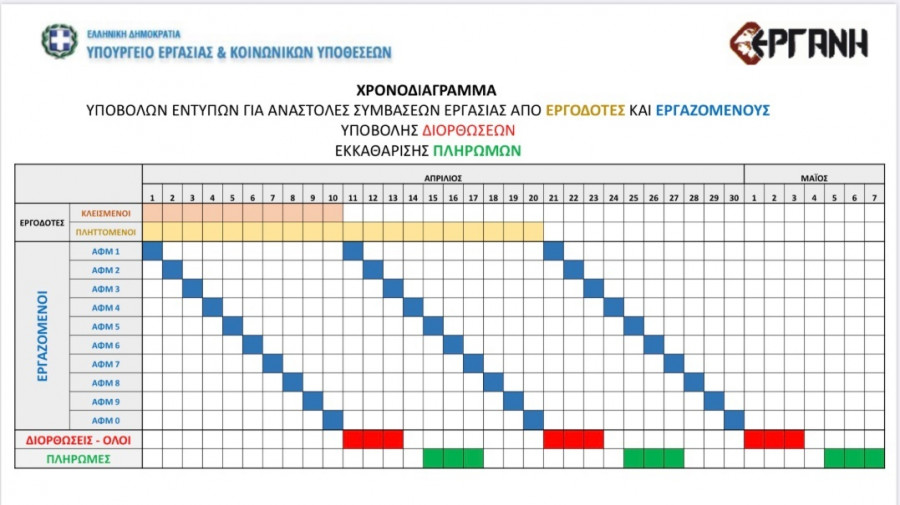 Όπως αναφέρει, ο πίνακας με το χρονοδιάγραμμα υλοποίησης αφορά την υποβολή εντύπων επιχειρήσεων και εργαζομένων, με βάση το ΑΦΜ, τους χρόνους διορθώσεων και τους χρόνους καταβολής των 800 ευρώ (σε τρεις φάσεις).