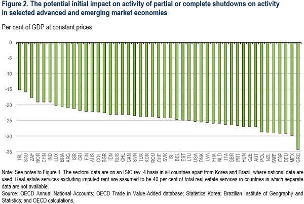 Στην ανάλυση του ΟΟΣΑ χρησιμοποιείται σενάριο που υπολογίζει τις βραχυπρόθεσμες οικονομικές επιπτώσεις από μια μείωση της δραστηριότητας πάνω από 50% και ως 100% σε διαφόρους τομείς.