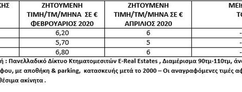 Το Πανελλαδικό Δίκτυο Κτηματομεσιτών E-Real Estates πραγμαροποίησε έρευνά με τις πρώτες τάσεις μείωσης των ζητούμενων τιμών ενοικίασης κατοικιών 90-110 τμ άνω του 1ου ορόφου κατάλληλα για οικογένειες , έτος κατασκευής μετά το 2000.