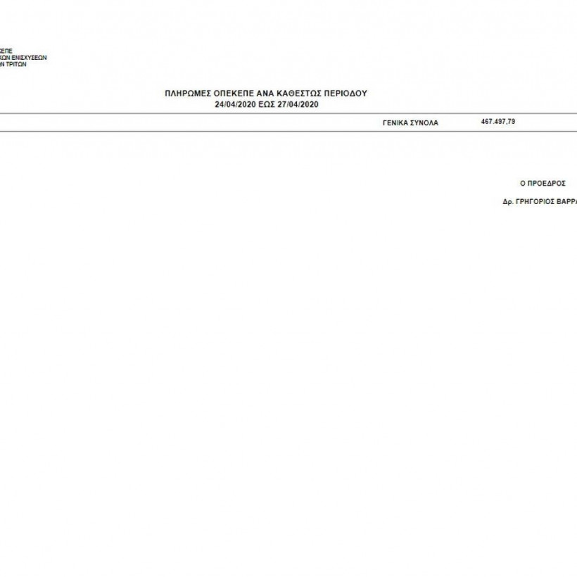 Πιο συγκεκριμένα, ο οργανισμός από 24/04/2020 έως τις 27/04/2020 κατέβαλε σε 185 δικαιούχους το ποσό των 467.497,79 ευρώ.