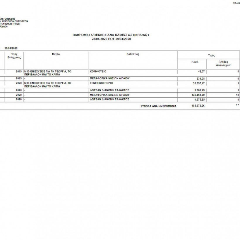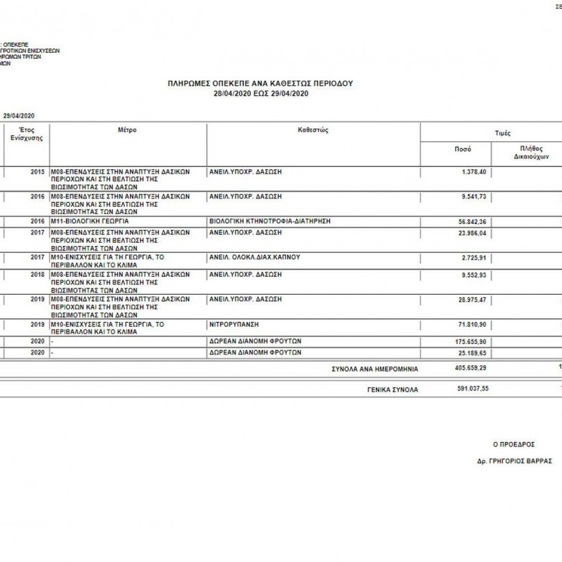 Πιο συγκεκριμένα, ο οργανισμός από 28/04/2020 έως τις 29/04/2020 κατέβαλε σε 185 δικαιούχους το ποσό των 591.037,55 ευρώ.