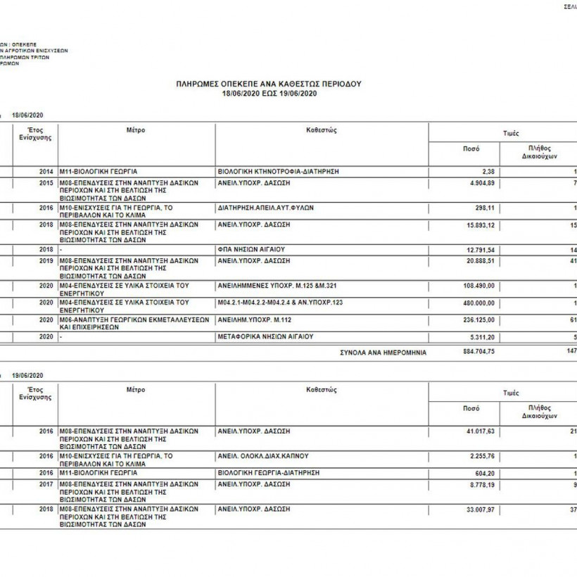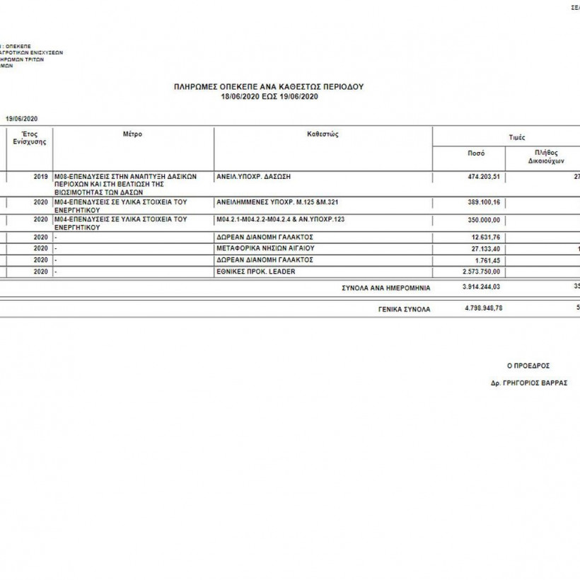 Πιο συγκεκριμένα, ο οργανισμός από 18/06/2020 έως τις 19/06/2020 κατέβαλε σε 503 δικαιούχους το ποσό των 4.798.948,78 ευρώ.