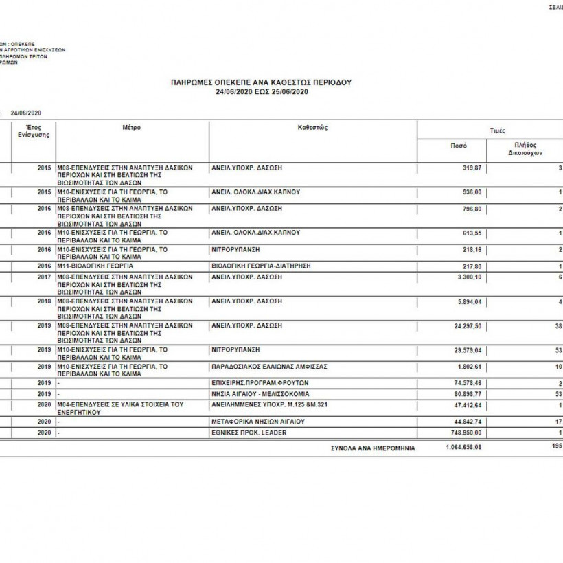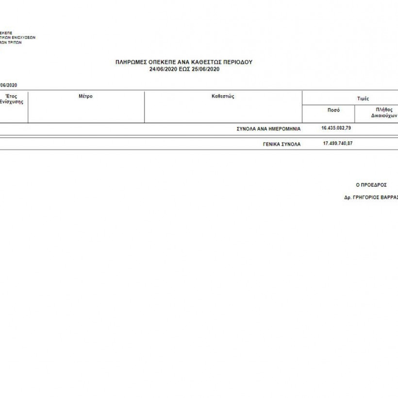 Πιο συγκεκριμένα, ο οργανισμός από 24/06/2020 έως τις 25/06/2020 κατέβαλε σε 9.913 δικαιούχους το ποσό των 17.499.740,87 ευρώ.