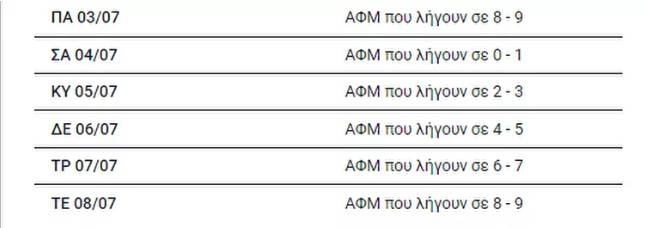 Ειδικότερα, οι νέες ημερομηνίες είναι από το Σάββατο 4 Ιουλίου έως και την Τετάρτη 8 Ιουλίου, ενώ αύριο, Παρασκευή 3 Ιουλίου, υποβάλλουν την αίτησή τους όσοι έχουν ΑΦΜ που λήγει σε 8-9.