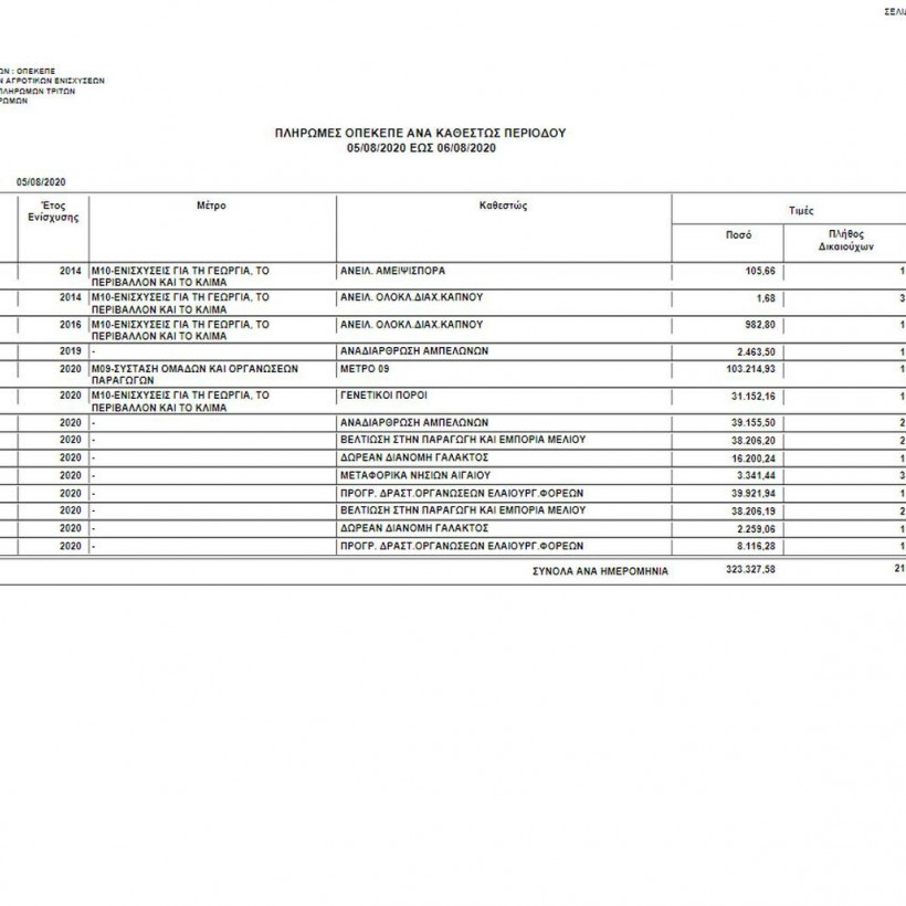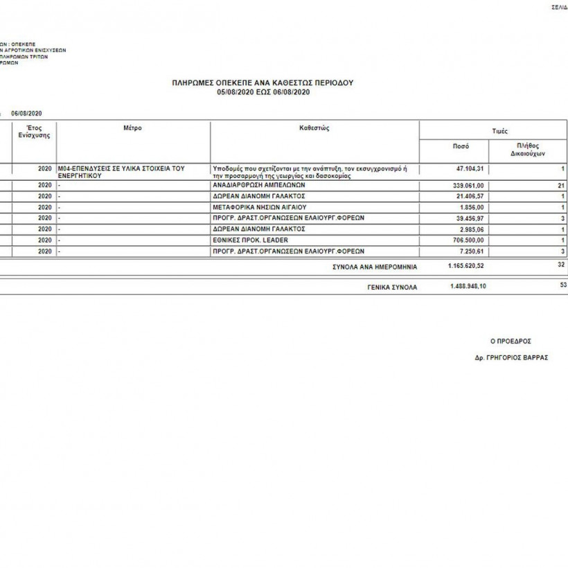 Πιο συγκεκριμένα, ο οργανισμός από 05/08/2020 έως τις 06/08/2020 κατέβαλε σε 38 δικαιούχους το ποσό του 1.488.948,10 ευρώ.