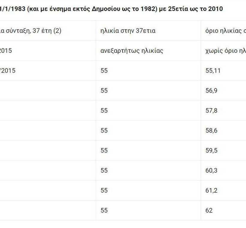 • Δημόσιος υπάλληλος που προσλήφθηκε στο Δημόσιο μετά το 1983, αλλά είχε και ΙΚΑ πριν από το 1983, και συμπλήρωσε την 25ετία ως το 2010, βγαίνει με ευνοϊκότερο όριο ηλικίας, που αντιστοιχεί στη συμπλήρωση του 55ου έτους, αρκεί να έχει συνολικά 37 έτη. Αν έχει την 37ετία το 2017 (παίρνοντας και 2 έτη από στρατιωτική θητεία), βγαίνει στα 57,8, ενώ αν έχει το 2020 την 37ετία παίρνει σύνταξη στα 60,3.