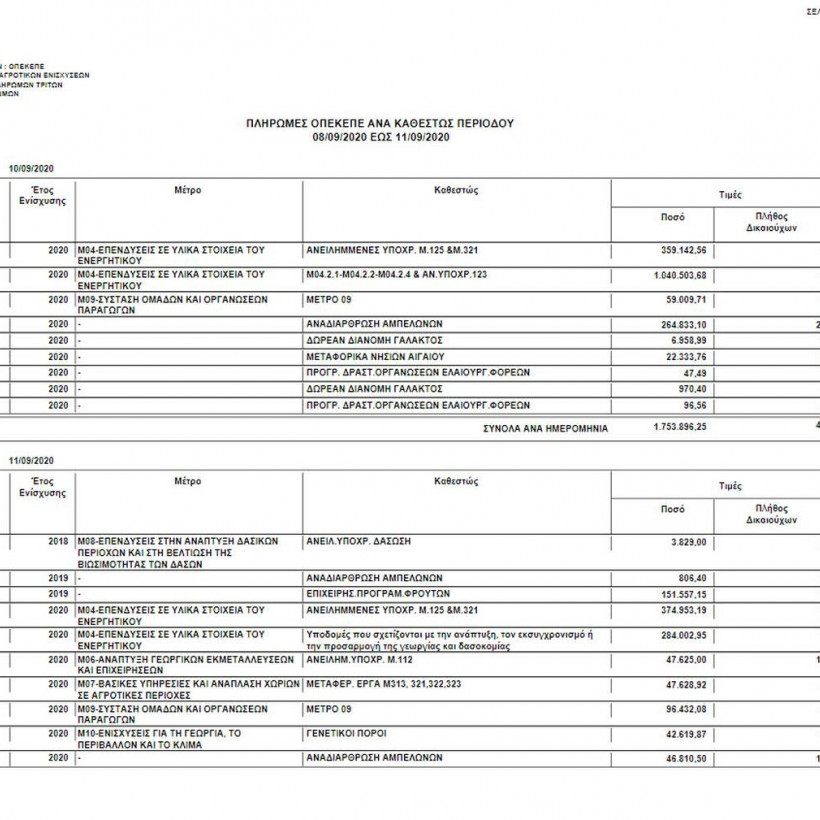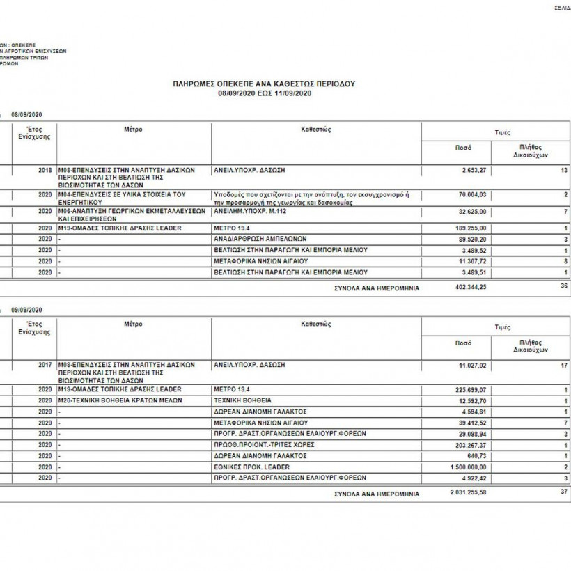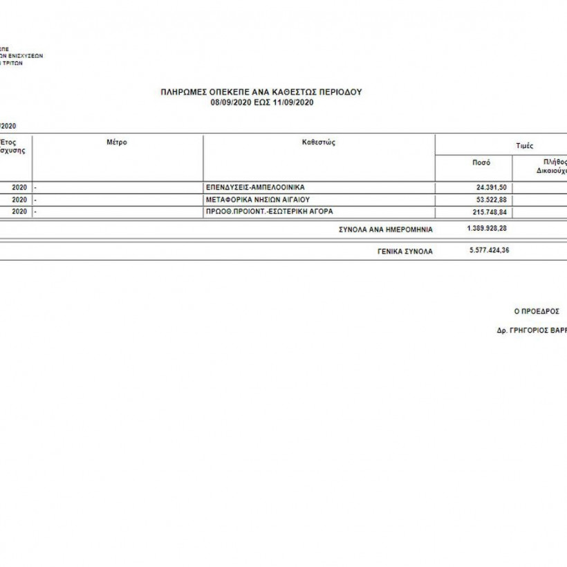 Πιο συγκεκριμένα, ο οργανισμός από 08/09/2020 έως τις 11/09/2020 κατέβαλε σε 168 δικαιούχους το ποσό των 5.577.424,36 ευρώ.