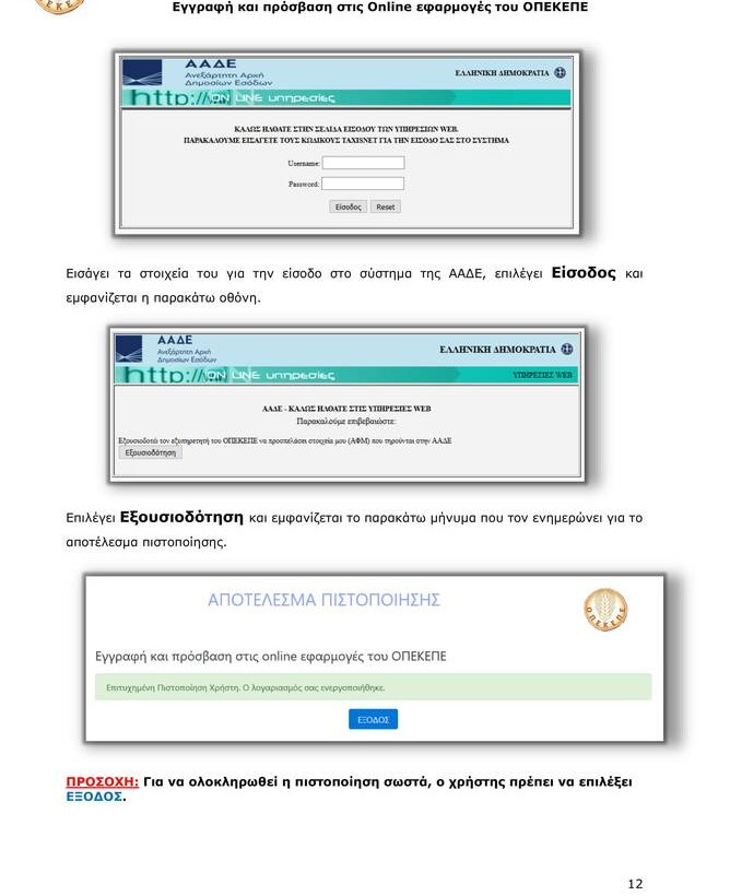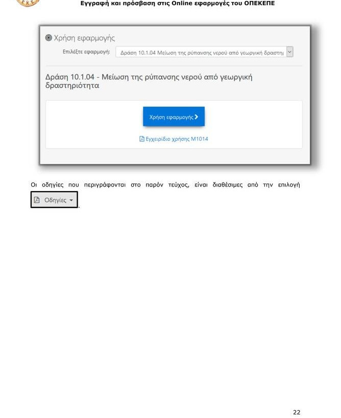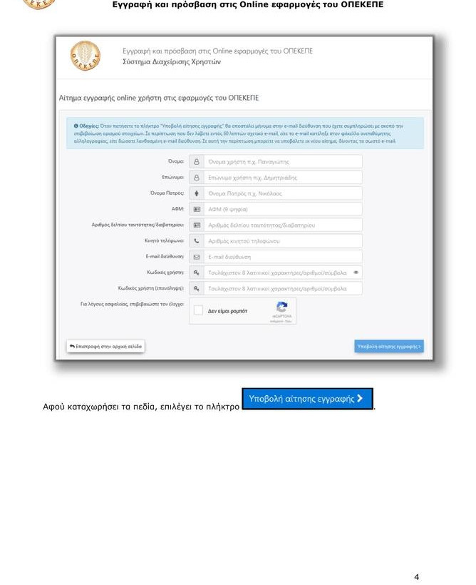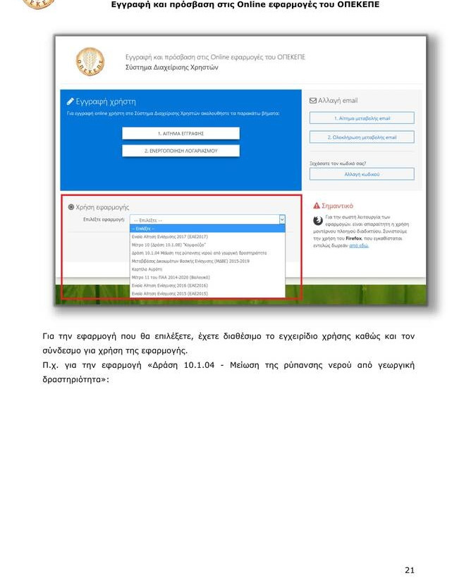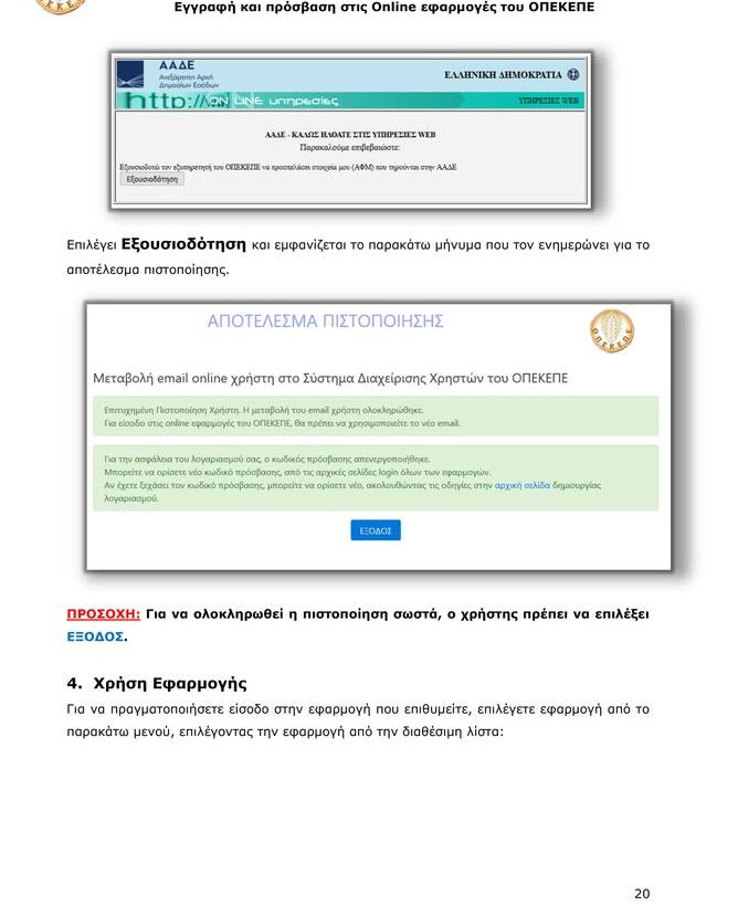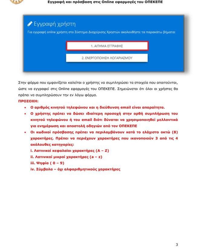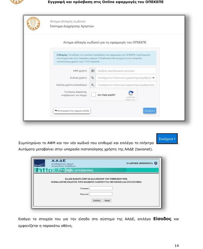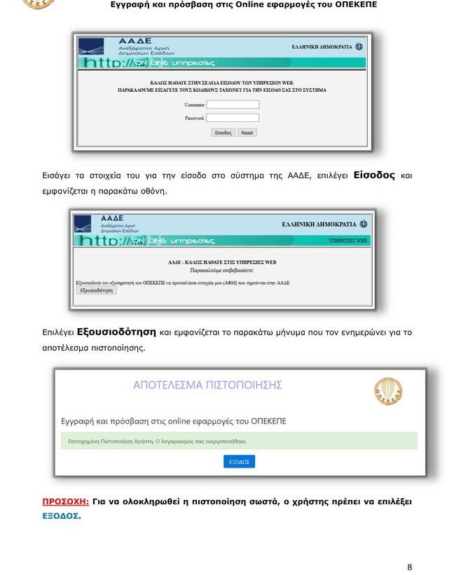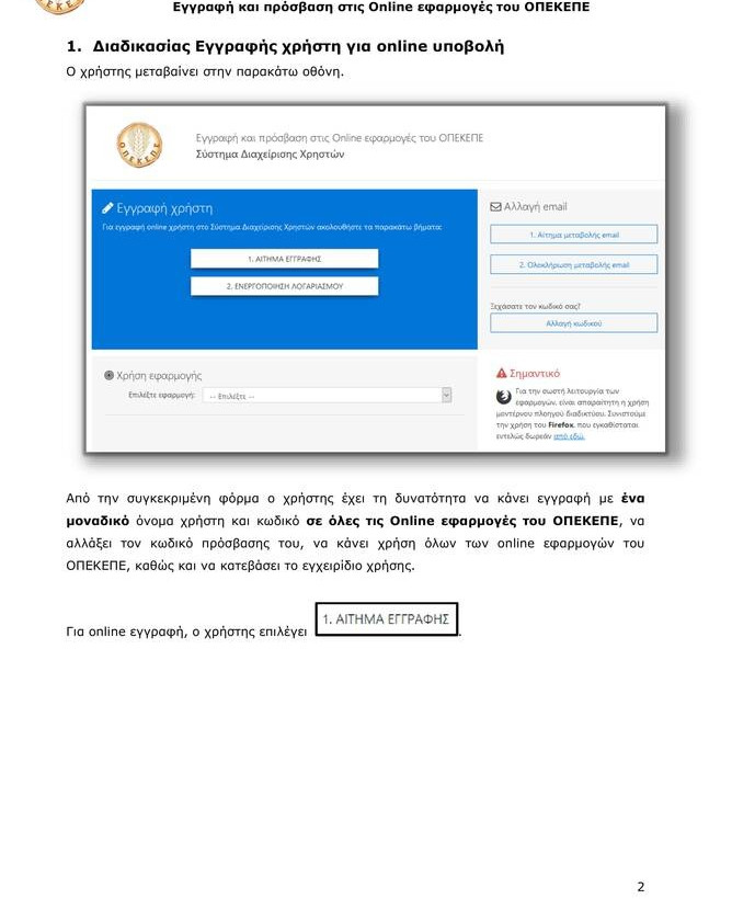 Επισημαίνεται ότι παραγωγοί, οι οποίοι είναι ήδη εγγεγραμμένοι στις οn-line εφαρμογές του ΟΠΕΚΕΠΕ μέσω εγγραφής στην ιστοσελίδα https://registration.dikaiomata.gr/user_registration/ για τα έτη (2014-2019) ή έχουν υποβάλλει αίτηση στα γεωργοπεριβαλλοντικά μέτρα (Βιολογικές Καλλιέργειες, Κομφούζιο, Νιτρορύπανση) για την είσοδό τους μπορούν να χρησιμοποιήσουν τα τελευταία επικαιροποιημένα στοιχεία ταυτοποίησης (όνομα χρήστη, κωδικό). Δεν απαιτείται εκ νέου εγγραφή στο σύστημα ή πιστοποίηση μέσω taxisnet.