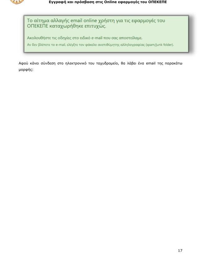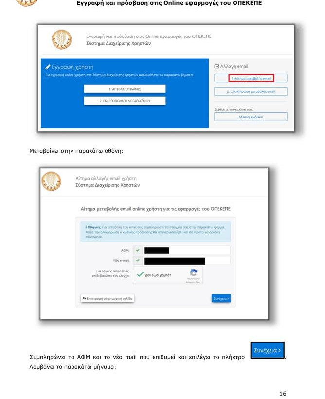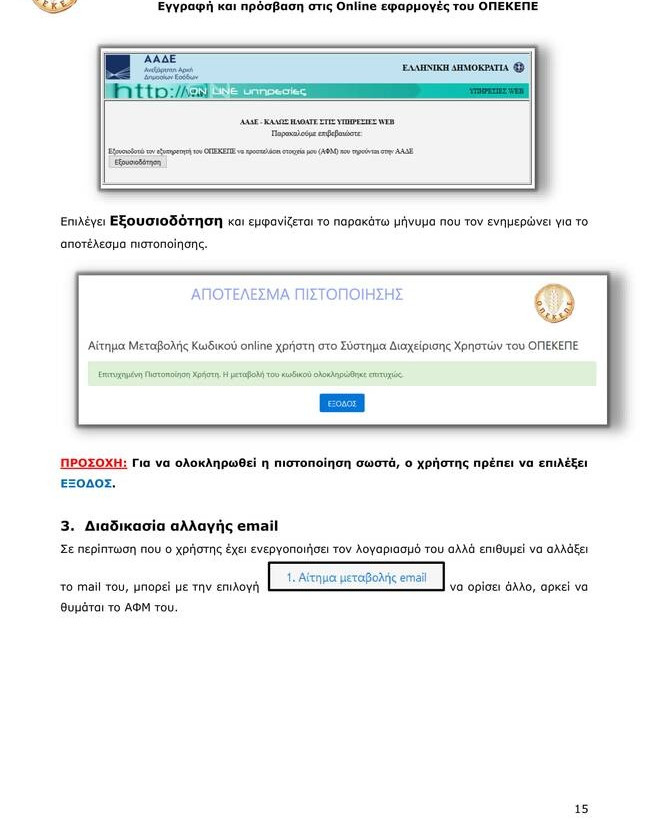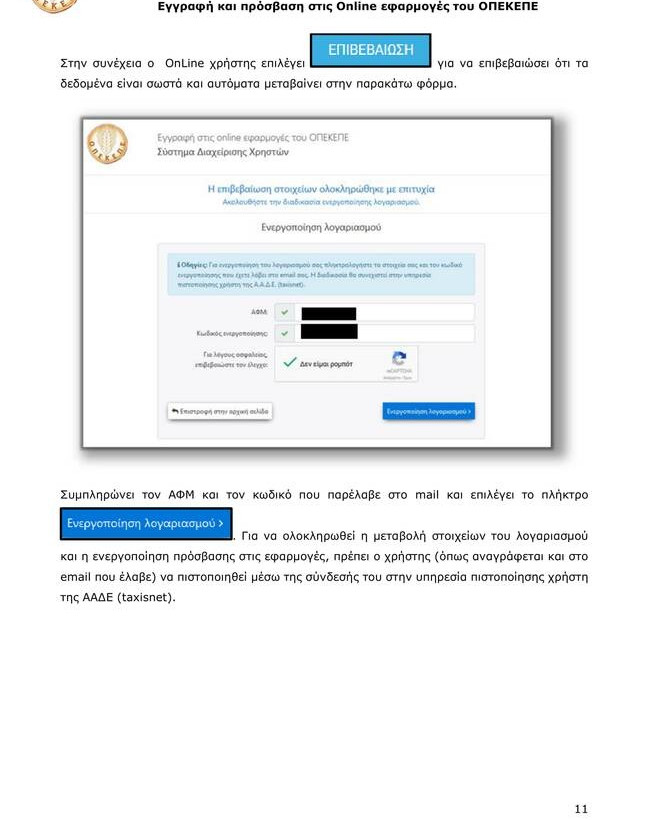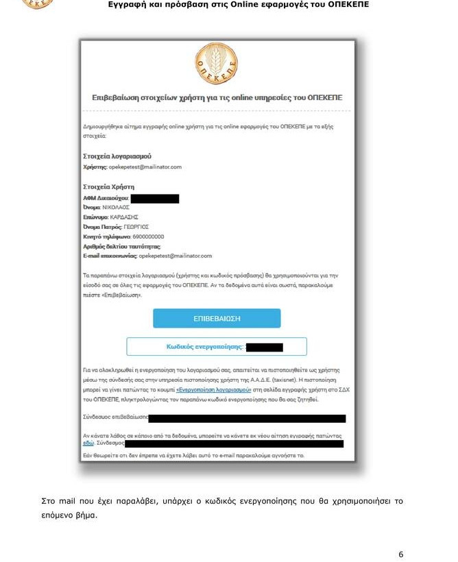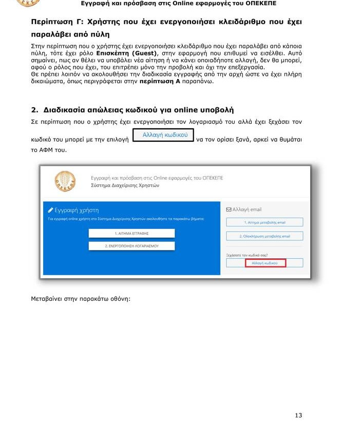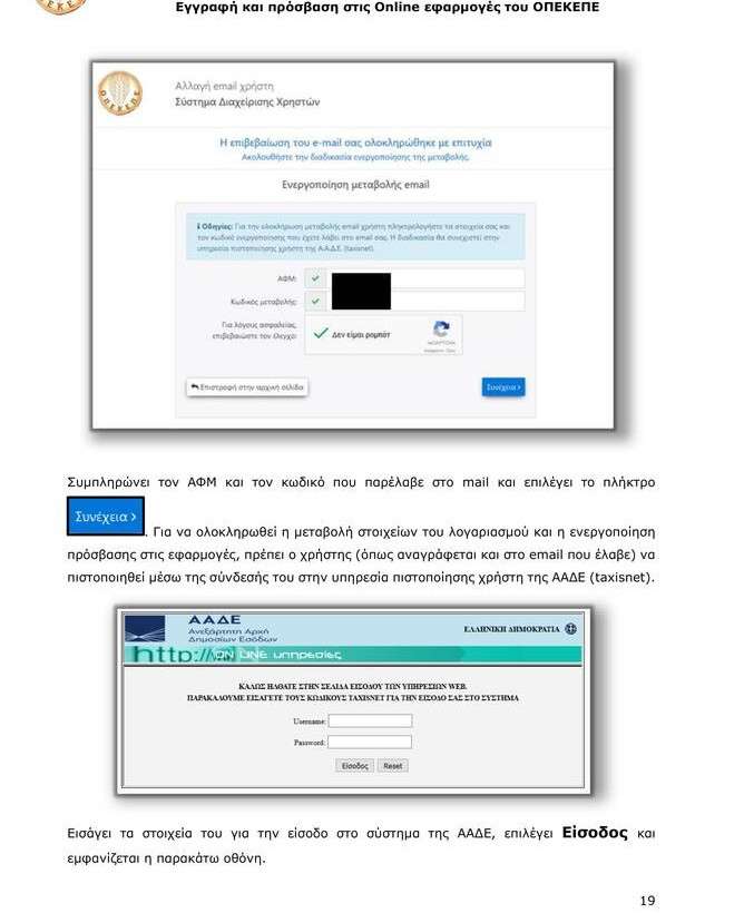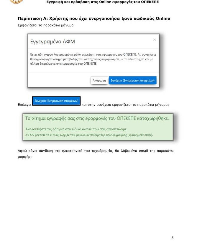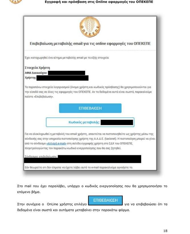 Επισημαίνεται ότι παραγωγοί, οι οποίοι είναι ήδη εγγεγραμμένοι στις οn-line εφαρμογές του ΟΠΕΚΕΠΕ μέσω εγγραφής στην ιστοσελίδα https://registration.dikaiomata.gr/user_registration/ για τα έτη (2014-2019) ή έχουν υποβάλλει αίτηση στα γεωργοπεριβαλλοντικά μέτρα (Βιολογικές Καλλιέργειες, Κομφούζιο, Νιτρορύπανση) για την είσοδό τους μπορούν να χρησιμοποιήσουν τα τελευταία επικαιροποιημένα στοιχεία ταυτοποίησης (όνομα χρήστη, κωδικό). Δεν απαιτείται εκ νέου εγγραφή στο σύστημα ή πιστοποίηση μέσω taxisnet.