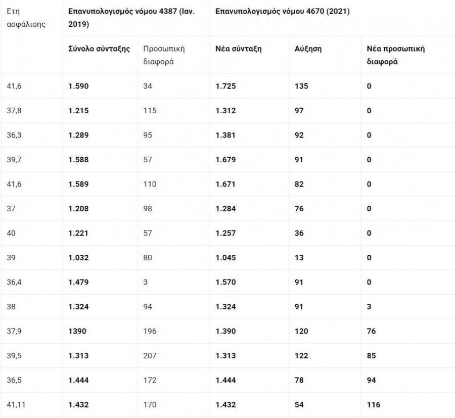 - Παλιός συνταξιούχος (του πίνακα 3) που αποχώρησε με 41,6 έτη ασφάλισης έχει από τον επανυπολογισμό του νόμου 4387, σύνταξη 1.590 ευρώ, εκ της οποίας τα 34 ευρώ είναι προσωπική διαφορά. Με τον νέο επανυπολογισμό παίρνει αύξηση 135 ευρώ, μηδενίζει την προσωπική διαφορά και η σύνταξη διαμορφώνεται στα 1.725 ευρώ. Η αύξηση θα δοθεί σε πέντε δόσεις των 27 ευρώ κατ’ έτος. Τον Μάρτιο του 2021 ο συνταξιούχος θα πάρει μαζί την αύξηση του 2020 και του 2021, δηλαδή 54 ευρώ με αναδρομικά 17 μηνών από την αύξηση του 2020, δηλαδή 459 ευρώ (27×17=459).