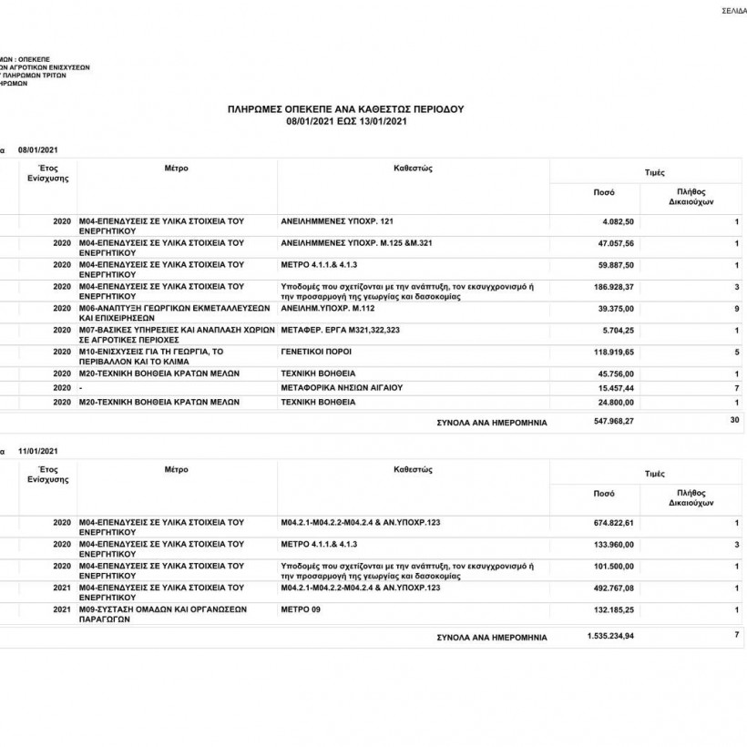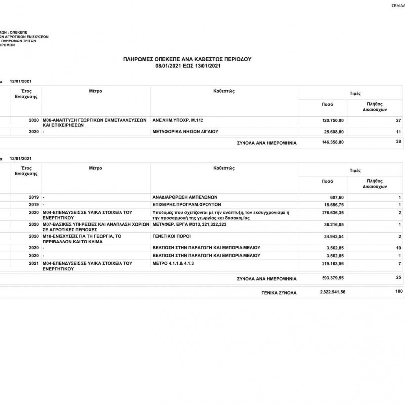 Πιο συγκεκριμένα, ο οργανισμός από 08/01/2021 έως τις 13/01/2021 κατέβαλε σε 100 δικαιούχους το ποσό των 2.822.941,56 ευρώ.