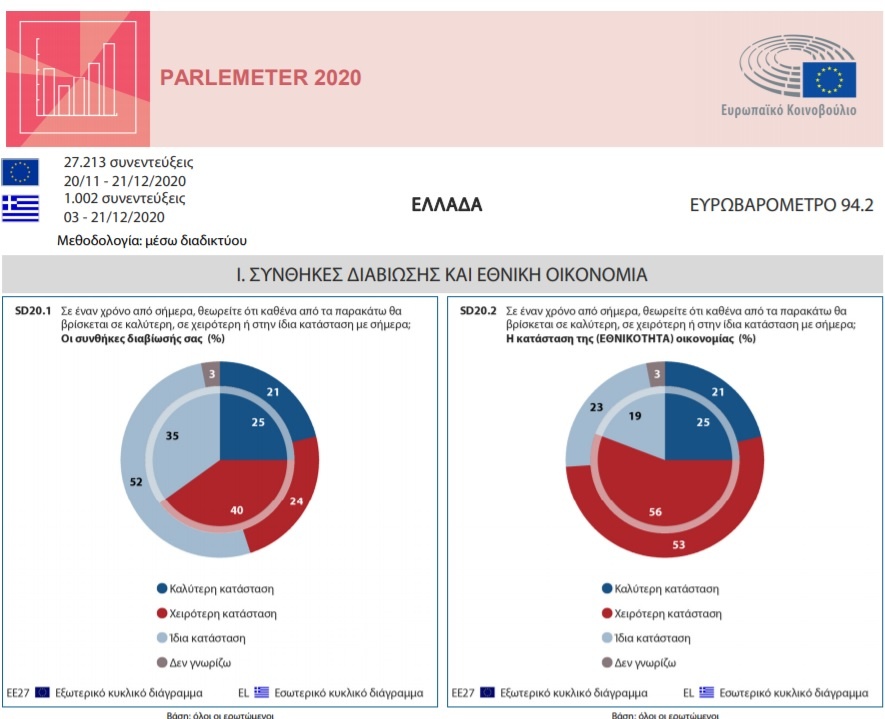 Αυτό προκύπτει από νέα έρευνα του Ευρωπαϊκού Κοινοβουλίου (Ευρωβαρόμετρο) που διενεργήθηκε από τον Νοέμβριο έως τον Δεκέμβριο του 2020 από την Kantar. Δεδομένης της επετείου για τα 40 χρόνια από την ένταξη της Ελλάδος στην ΕΕ, η έρευνα εξετάζει και σχετικά θέματα με την αντίληψη των πολιτών για τα κέρδη από της συμμετοχή της χώρας στο ευρωπαϊκό εγχείρημα.