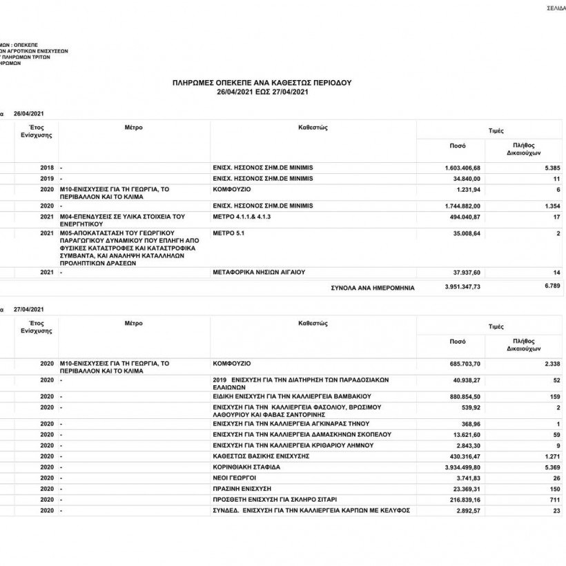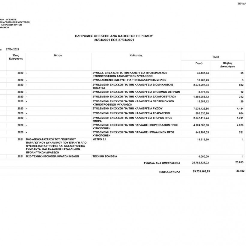 Συγκεκριμένα, ο οργανισμός το διάστημα από τις 26/04/2021 έως τις 27/04/2021 κατέβαλε σε 30.402 δικαιούχους το ποσό των 29.733.468,75.
