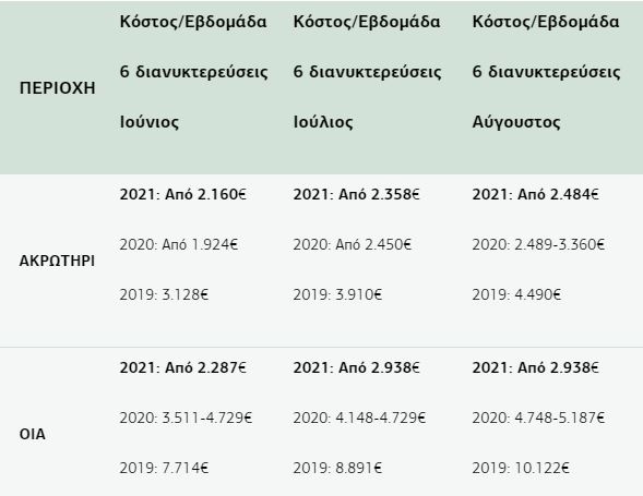 Η πληρότητα στο νησί των ανέμων για ιδιωτική βίλα με ιδιωτική πισίνα (με δωρεάν πολιτική ακύρωσης και χωρίς προκαταβολή) αγγίζει το 85% για Ιούνιο, Ιούλιο και Αύγουστο, ενώ υπάρχουν χρονικά διαστήματα εντός των καλοκαιριών μηνών κατά τα οποία η πληρότητα αγγίζει το 99%. Στη Σαντορίνη, η πληρότητα κυμαίνεται από 90% έως 96% για το σύνολο των καλοκαιρινών μηνών (Ιούνιο – Αύγουστο).