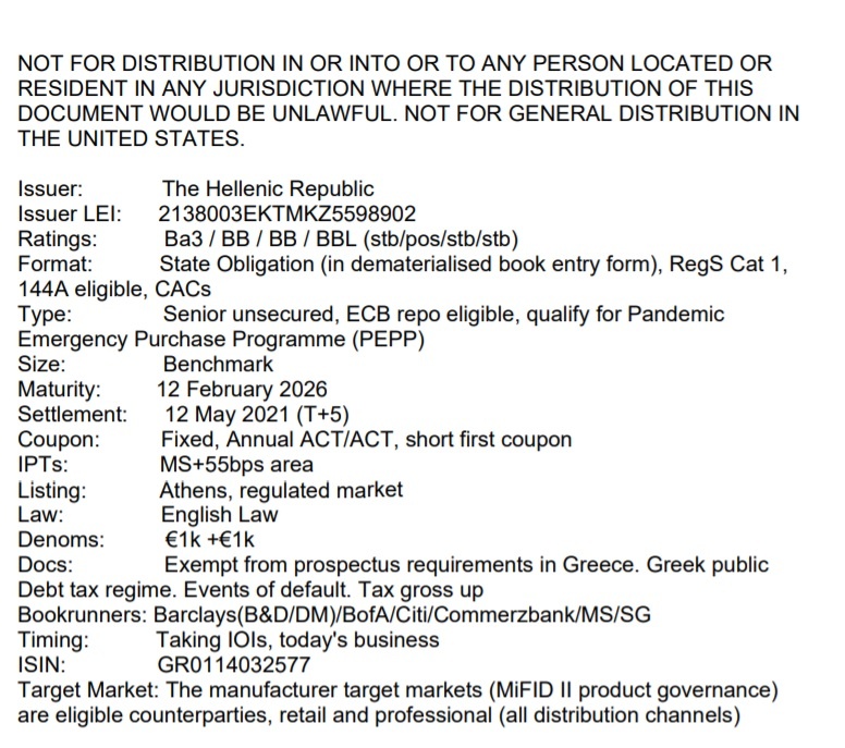 Ο ΟΔΔΗΧ έχει αναθέσει στις Barclays, BofA Securities, Citi, Commerzbank, Morgan Stanley και Societe Generale ως Joint Lead Managers την αναδοχή της έκδοσης του πενταετούς χρεογράφου λήξης το Φεβρουάριο του 2026.
