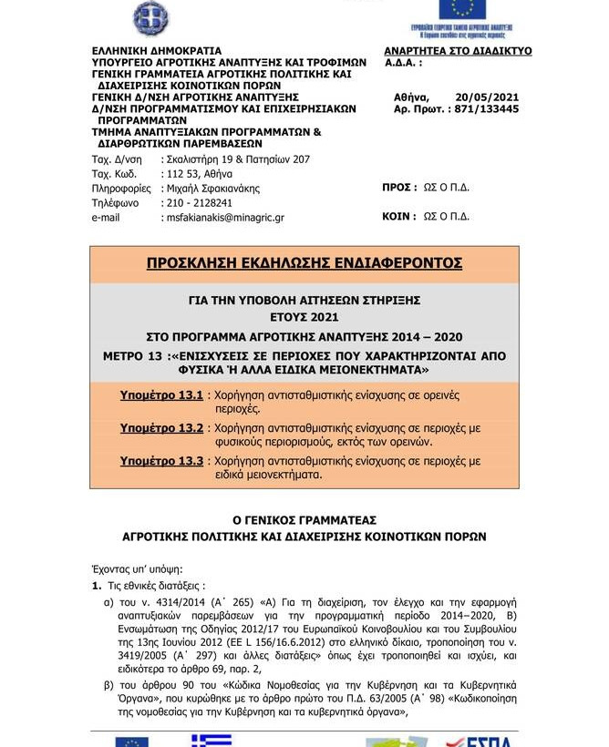 ΟΠΕΚΕΠΕ | Αγρότες - Όλες οι ειδήσεις: Μέχρι τη Δευτέρα, 19 Ιουλίου θα γίνονται δεκτές οι αιτήσεις για την εξισωτική αποζημίωση όπως αναγράφεται στην προκήρυξη του Μέτρου, την οποία εξέδωσε η Γενική Διεύθυνση Αγροτικής Ανάπτυξης, του υπ. Αγροτικής Ανάπτυξης.