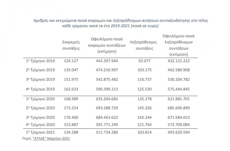 Οι ληξιπρόθεσμες (εκκρεμείς πάνω από 90 ημέρες) αιτήσεις συνταξιοδότησης μειώθηκαν από 121.764 στο τέλος Δεκεμβρίου 2020 (εκτιμώμενη δαπάνη περίπου 572,7 εκατ. ευρώ) σε 103.814 στο τέλος Μαρτίου 2021 (εκτιμώμενη δαπάνη περίπου 493,6 εκατ. ευρώ).